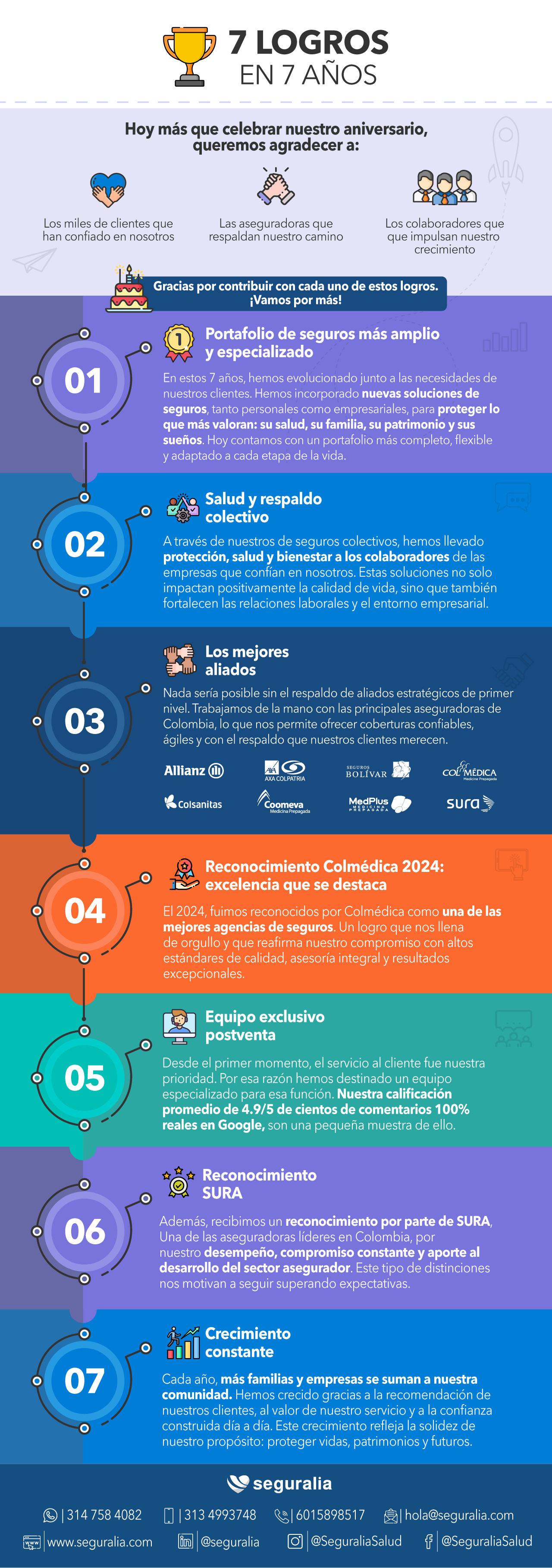 En Seguralia estamos de aniversario, y no podríamos estar más orgullosos de lo que hemos construido. Durante estos 7 años, nos hemos enfocado en ofrecer soluciones reales para personas, familias y empresas en Colombia. Nuestra historia es una suma de compromiso, alianzas estratégicas, servicio humano y un propósito claro: proteger lo que más importa.